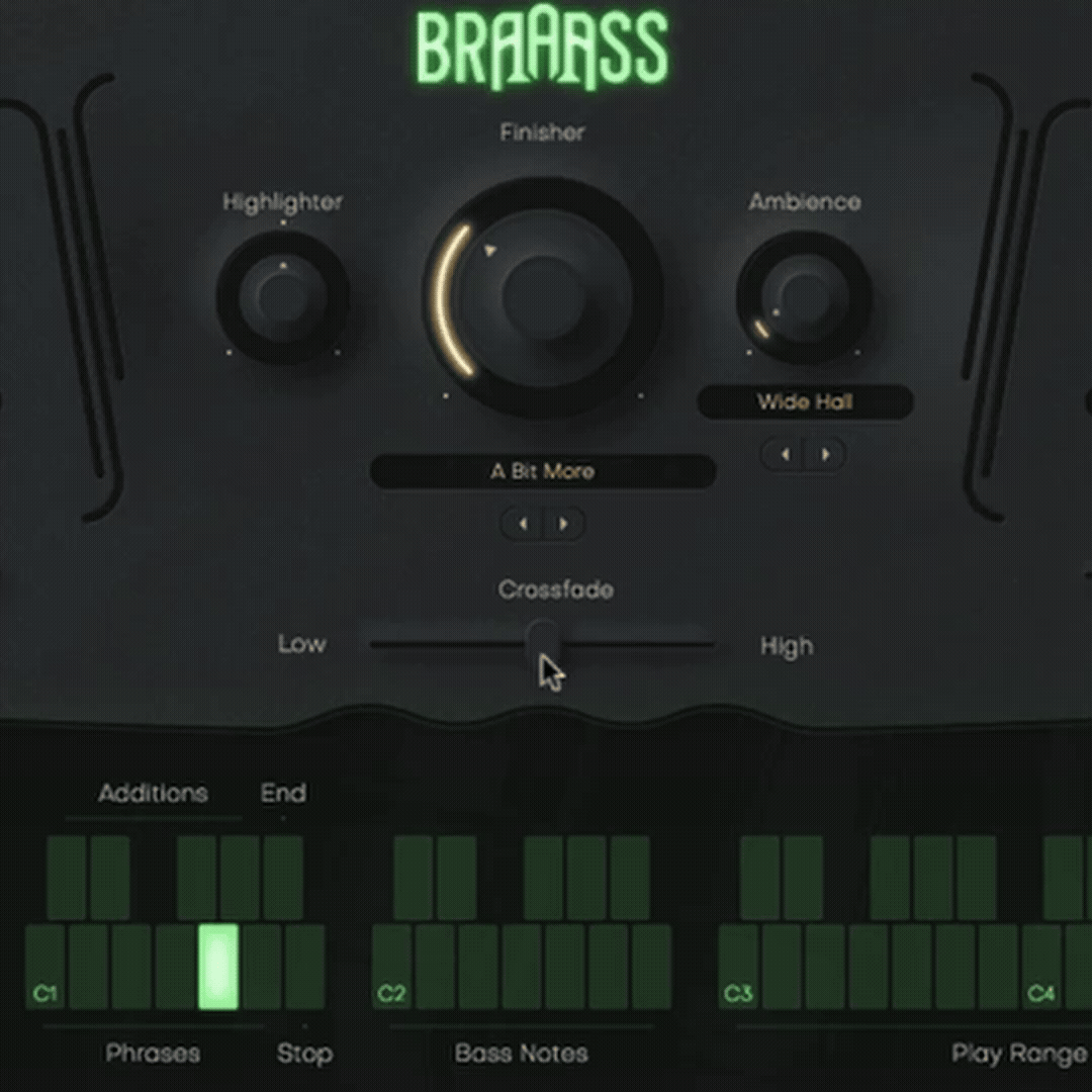 저음 브라스(튜바, 베이스 트롬본)와 고음 브라스(트럼펫, 호른)를 개별적으로 컨트롤할 수 있습니다. 크로스페이드 슬라이더로 두 섹션을 자연스럽게 섞고, 각 레이어에 내장된 Character 및 Motion FX를 활용해 독창적이고 다이내믹한 결과를 만들어낼 수 있습니다.